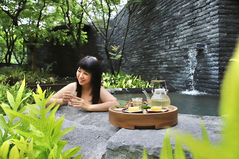 體驗完手洗愛玉,午後時段正好移步至露天溫泉大眾湯,享受專屬的包場時段約一小時。谷關夏天的氣溫比平地低五度,山間涼風徐徐吹來,使得夏日泡湯成為一種和秋冬截然不同的享受,藉由泡湯的過程促進新陳代謝、乳化肌膚表面使得水分蒸發及散熱,泡湯時還可啜飲原住民在夏天喜愛飲用的月桃涼茶,搭配柑橘羊羹,盡情沈浸在大浴場及露天溫泉裡,不受打擾的私密時光。