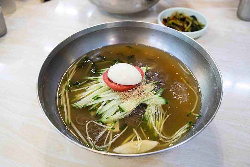 炎熱的夏天常讓人感到食慾不振,此時就來一碗漂浮著碎冰的韓國涼夏美食「冷麵(냉면)」吧!走進韓國賣冷麵的食堂,會發現冷麵分成兩種,一種是黃褐色的水冷麵,碗裡用蔬果、魚乾熬煮成的高湯裡有層冰涼的碎冰,滋味十分清爽;另一種是紅通通,光看就很辛辣的「拌冷麵(비빔면)」,也可稱作乾冷麵、拌拌麵。看似很辣的拌冷麵醬料其實辣中帶甜,把醬料和黃瓜絲、泡菜、芝麻用筷子拌勻,吃之前用剪刀把細長的麵條剪成方便入口的長度,冰鎮過的乾冷麵和放了碎冰的水冷麵同樣是冰冰涼涼的,不愧是韓國涼夏美食的代表。