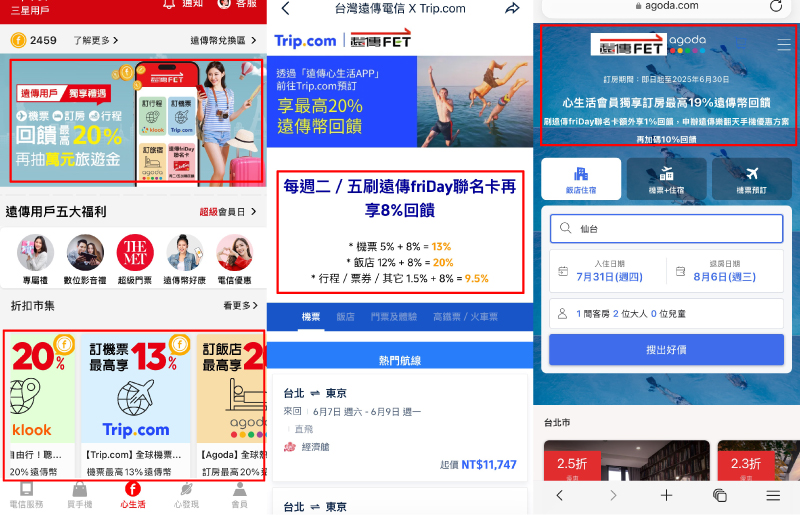 遠傳心生活APP搭配Klook、Trip.com、Agoda最高可回饋20%遠傳幣。(圖片來源:遠傳FET)