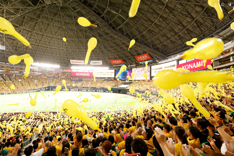 福岡軟銀鷹隊的主場比賽時,全場會在象徵Lucky Seven的第7局結束時,放出黃色噴射氣球,營造熱鬧的黃色應援氣氛。(圖片來源:翻攝自福岡ソフトバンクホークス Facebook)