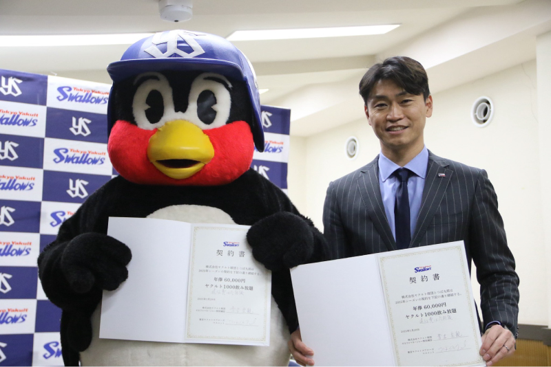 養樂多燕子的吉祥物燕九郎,2025年以年薪6萬日幣、無限暢飲「養樂多Yakult 1000」條件更新合約。(圖片來源:翻攝自東京ヤクルトスワローズ官方推特)