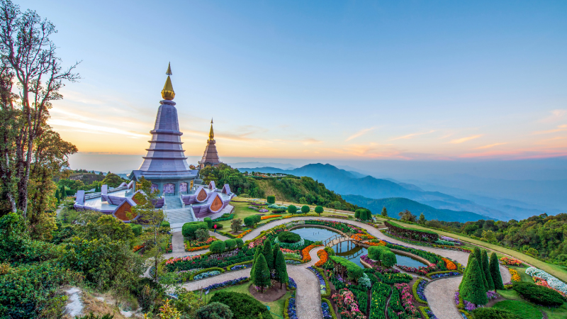 泰國最高峰的「茵他儂山」(海拔2,565公尺)被譽為「泰國屋脊」,而茵他儂國家公園(Doi Inthanon National Park)不僅是泰國最受歡迎的國家公園,也成了喜愛戶外、自然的旅人必訪之地。園內氣候濕涼,擁有豐富的高山生態,1月底~2月初可欣賞暹羅櫻花綻放、3月~7月更是觀賞鳥類的天堂。在園區健行裡除了壯觀的瀑布、溪流與層疊山景,不能錯過的還有地標-為紀念泰皇與皇后而建的雙佛塔,推薦在Kew Mae Pan步道入口處觀賞日出、並於雙佛塔周邊欣賞日落美景。如果想多留點時間悠閒賞景,茵他儂國家公園也提供餐廳和住宿。