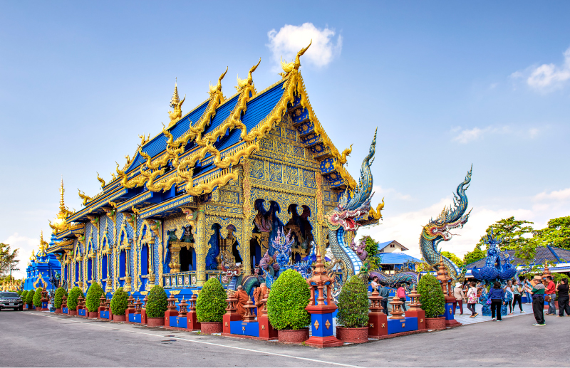 許多人到清邁旅遊,會專程安排造訪距離清邁3小時車程的清萊。清萊藝術氛圍濃厚,最著名的景點有「白廟」(Wat Rong Khun,又稱白龍寺或龍昆寺),純白建築在陽光下閃閃發光,如同通往聖傑的佛陀淨土。與之形成強烈對比的,則是由白廟設計者弟子打造,色彩濃烈的「藍廟」(Wat Rong Suea Ten,也稱舞虎寺),內部有精緻的佛像和壁畫,魔幻又神祕的藍色、金色帶來震撼的視覺效果。