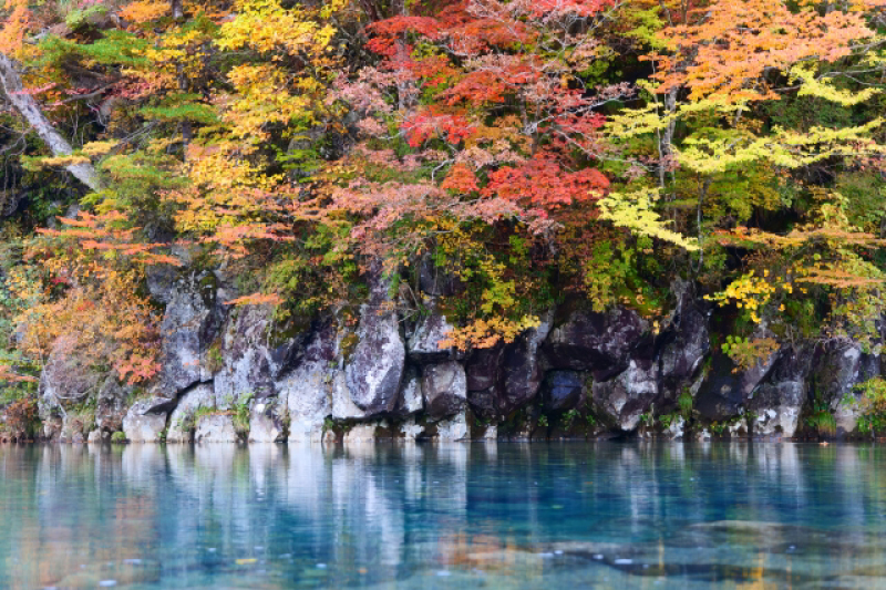 須川湖湖面倒映著山中綠、黃、紅交織的色彩。(圖片來源:写真AC)