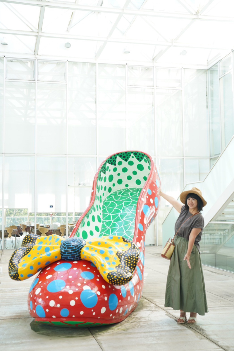 另一件展品「紅色的高跟鞋」位在室內,年歲已高卻還是十分愛美的草間彌生是高跟鞋的熱愛者,曾說過:「為了捉住未知的幸福,要一直穿著紅色高跟鞋直到生命最後一刻。」,來到這裡是否該穿著紅色高跟鞋和比人還高的高跟鞋合照一張呢!