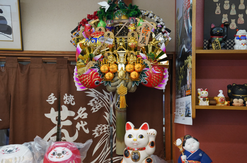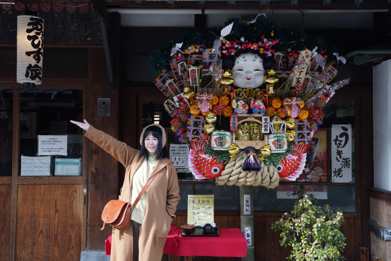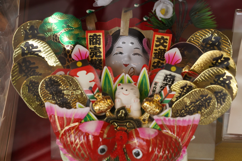 商家前裝飾著巨大的熊手,象徵招財進寶,把財富、顧客都耙進來。(圖片來源:妮可魯)