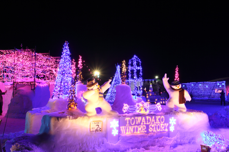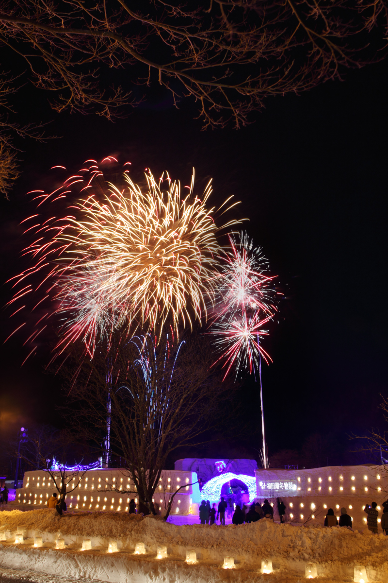 十和田湖畔休屋周遭的廣場上,佈置許多雪屋和雪雕,以及小朋友最愛的雪滑梯、雪地遊戲、打雪仗等活動,街道兩側的雪燈籠閃爍著燭光,為遊客照亮雪夜之路,兩邊亮著燈的屋台「雪燈橫丁」專售在地美食,鍋物、燉煮料理、熱甘酒,加上十和田名物烤牛肉丼,是驅走寒意的最佳補給,當煙火在漫天雪花襯托下華麗升空,比夏季煙火更具浪漫氛圍。