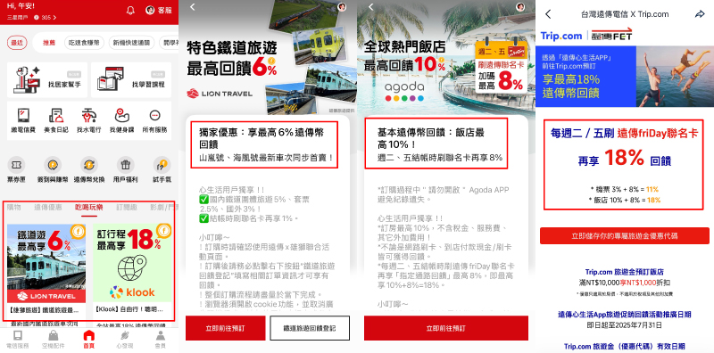 遠傳心生活APP搭配雄獅、Klook、Trip.com、Agoda最高可回饋18%遠傳幣。(圖片來源:遠傳FET)