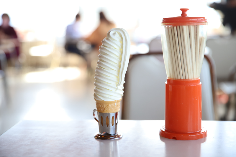 必點的有豬排拿坡里義大利麵,酥脆的炸豬排上淋了滿滿的蜜汁醬,搭配風味濃郁的義大利麵、清爽的生菜,一份才1180日圓就可以吃得超飽足,此外還有煎餃、拉麵、蛋包飯、咖哩飯等,同樣是份量滿滿,飯後必點高達10層的霜淇淋,一大根230日圓,奶味濃郁令人大滿足。