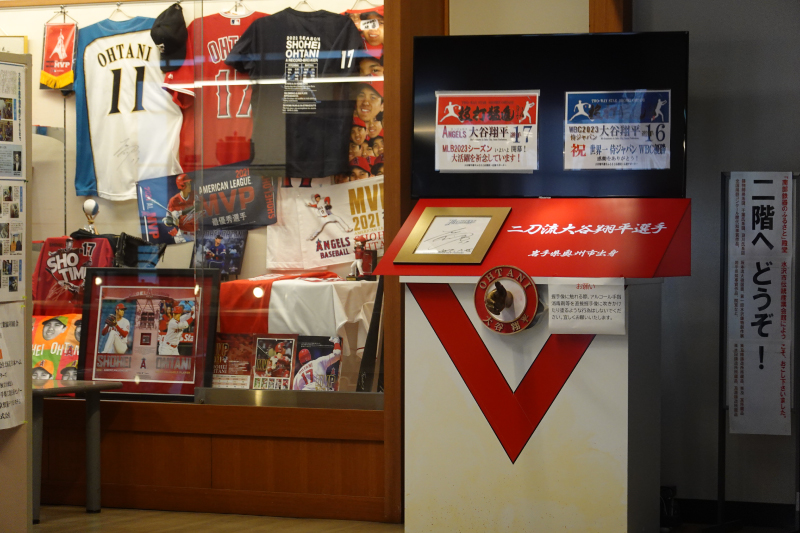 新幹線水沢江刺車站西口,可以找到大谷翔平「二刀流」姿態設計的人口蓋,站裡的「南岩手交流廣場」,展示了大谷翔平的簽名板、簽名周邊,以及球衣、媒體報導,拿不到大谷本身的簽名沒關係,拿取一些關於岩手縣的觀光情報資料,來一場大谷翔平故鄉的聖地巡禮吧!