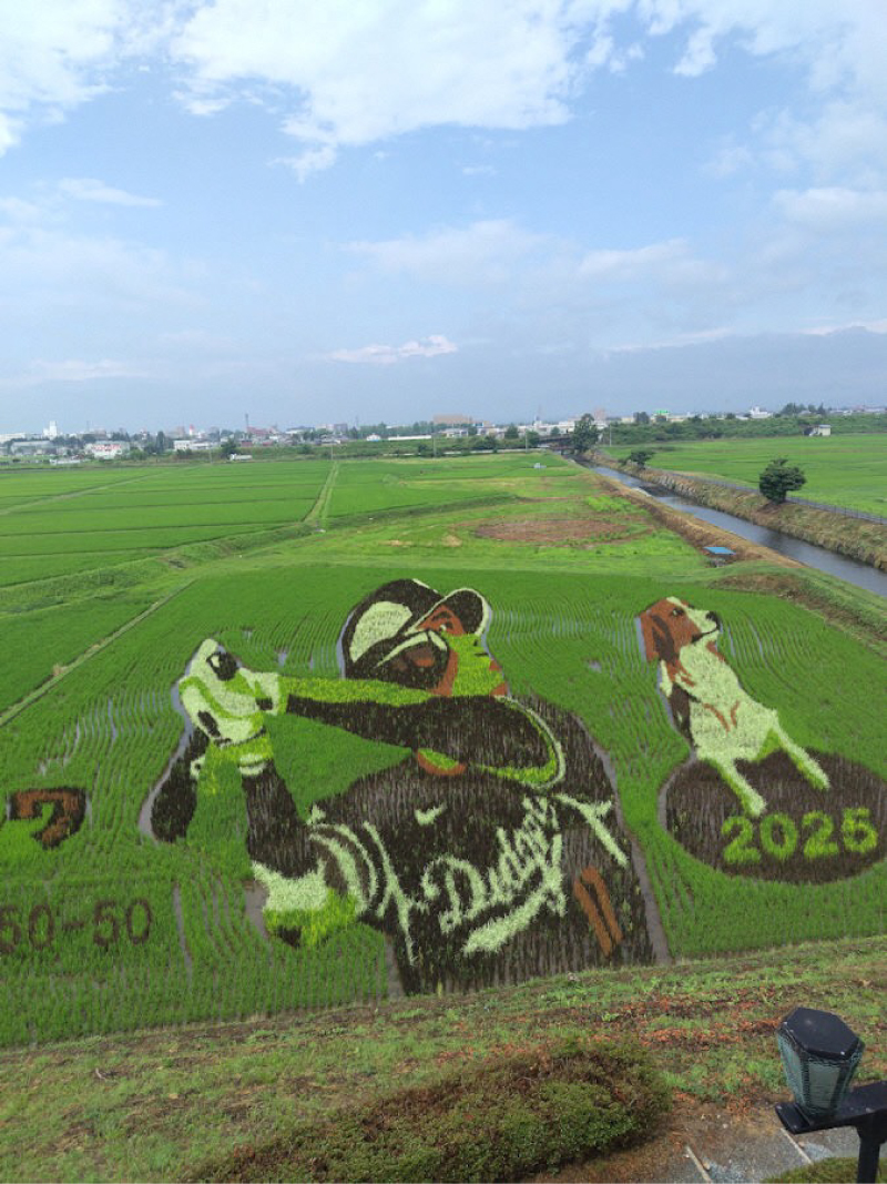 2025的圖案是大谷揮棒打擊的模樣和愛犬Decoy。(圖片來源:奥州アテルイの里 田んぼアート官網)