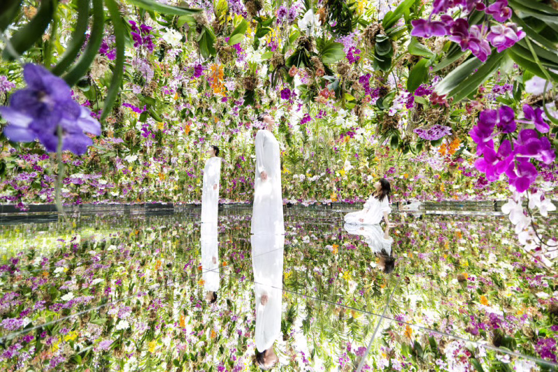萬朵懸浮在空中的蘭花忽上忽下,形成萬花筒般的鏡面世界。(圖片來源:teamLab官網)