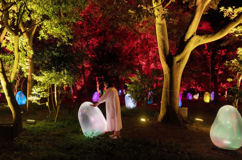 藝術作品會隨著花朵凋謝、草葉飄零而消失,風雨、觀眾的行為動作皆會讓環境產生變化,創造出「人、植物、環境與數位藝術共生的沉浸式夜間世界」。沒有固定動線,自由探索在茶花樹林裡的卵形體、隨風舞動的柱群光影、漂浮在池塘上的燈球,以及森林裡行走的肖像群之間,光影裝置結合自然景觀,夜幕下的植物園宛若夢境森林。