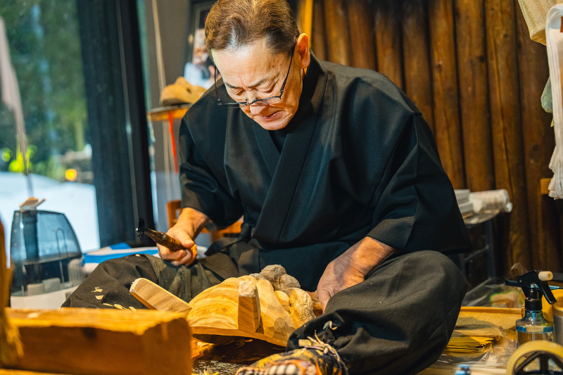 石川千秋為秋田縣目前唯一仍在製作生剝鬼面具的雕刻師,時不時會在館內親手雕刻生剝鬼面具。(圖片來源:Louis Liu)