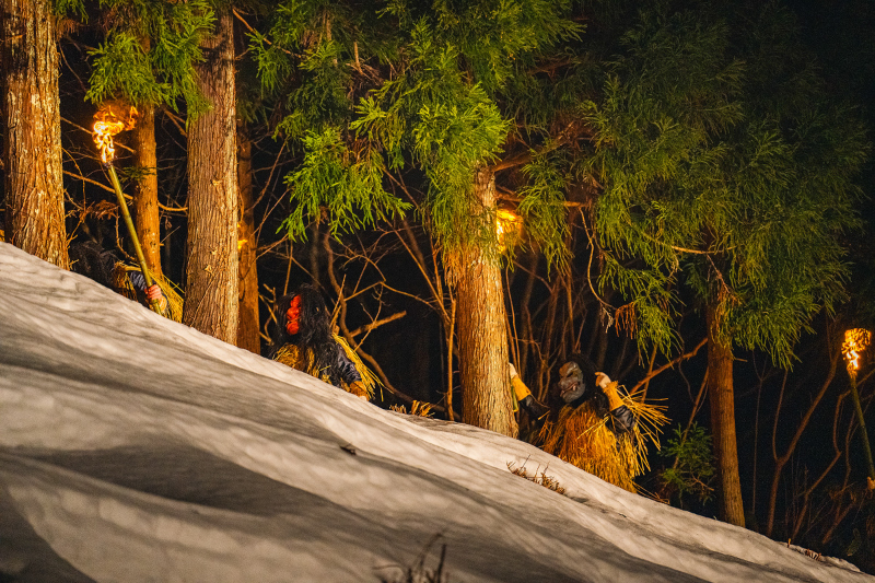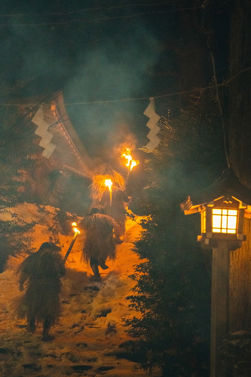當鼓聲響起時,人群的視線也開始集中在山林方向。接著便是整場祭典最令人期待的瞬間 –「生鬼下山,獻餅」。在火光與煙霧之中,戴著面具、身披稻草簑衣的生剝鬼從山林深處踏雪現身,緩緩在火光與鼓聲的陪伴下走向祭場,彷彿從傳說中走進現實,這一刻往往是整場祭典最令人嘆為觀止的畫面。