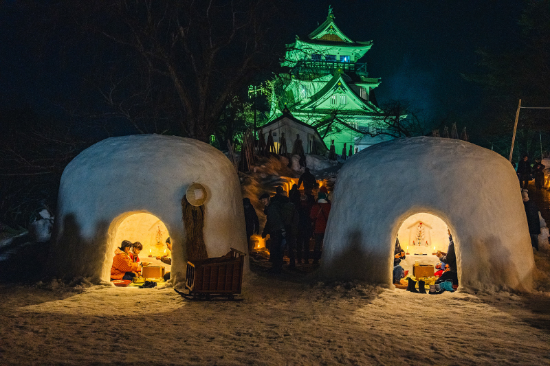 此外,整個雪屋所帶來的溫暖燭光在與高處的橫手城映襯下顯得格外壯麗,從橫手公園遠眺城市夜景時,還能望見蛇之崎川原的燭光景象。那裡排列著超過3,500個迷你雪屋與蠟燭,宛如一條雪地流動的銀河般延綿到遠方,為橫手冬夜增添一抹令人難忘的光景。
