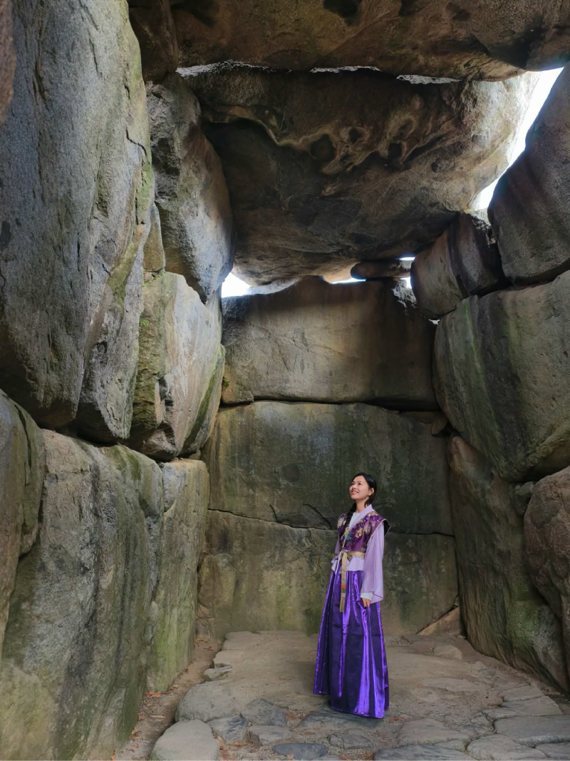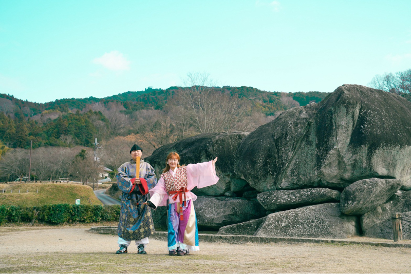 穿著古裝來到「石舞台古墳」,這座日本最大的橫穴式石室,巨大的石塊孤立於田野間,氣勢驚人。村內還散落著諸多謎團,像是酷似烏龜的「龜石」、外型奇特的「酒船石」,這些至今用途成謎的石造物,為這趟田野之旅增添了不少神祕色彩。