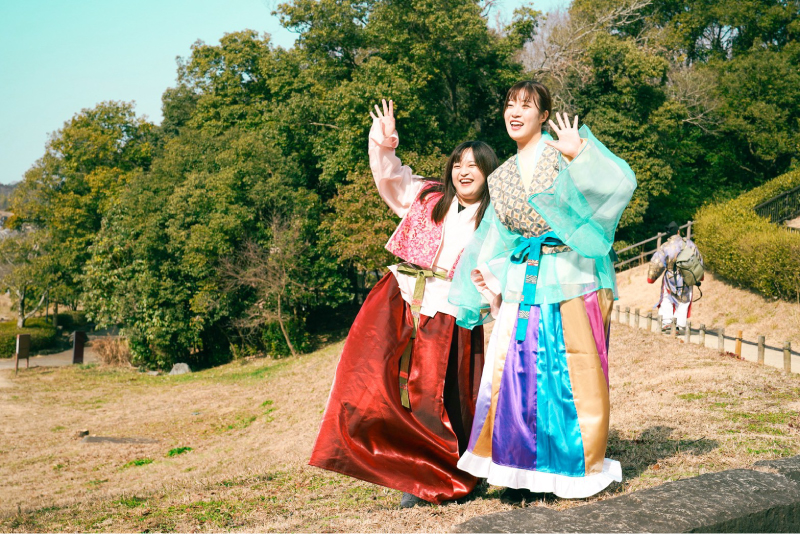 在明日香村,旅行不只是看風景,更是一場「儀式感」十足的穿越。旅人可以在飛鳥車站前的觀光案內所,換上色彩明豔的飛鳥時代宮廷服飾,那風格與唐代仕女圖如出一轍,彰顯了聖德太子意欲與中國隋唐文明接軌的雄心。