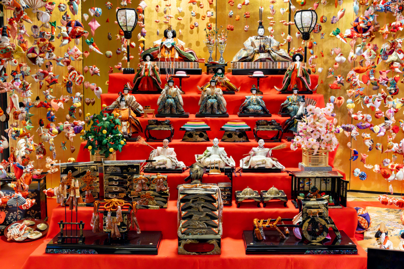 家裡有小女兒的人家,每到三月都會擺設華麗的「雛壇」,上面盡是穿著平安時代宮廷服飾的精緻人偶「雛人形」,最上一層是天皇、皇后,第二層是宮女、第三層是樂師,接下來是隨從、家具與嫁妝。