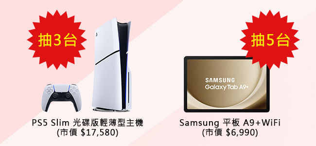 - 活動獎項: (1)PS5 Slim 光碟版輕薄型主機 3名(2)Samsung Galaxy Tab A9+ WiFi 版 5名,