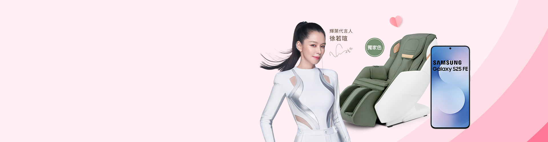 - 「月付$999起 按摩椅/多款手機/穿戴$0起」係指於遠傳門市申辦母親節指定方案(月租999/1399,綁約36/48期)並搭配指定按摩椅/手機/穿戴商品,享專案價最低$0。獨家係指本活動期間「輝葉Cway沙發按摩椅」獨家色油果綠、「三星Galaxy S25 FE 」為台灣電信業者獨家。