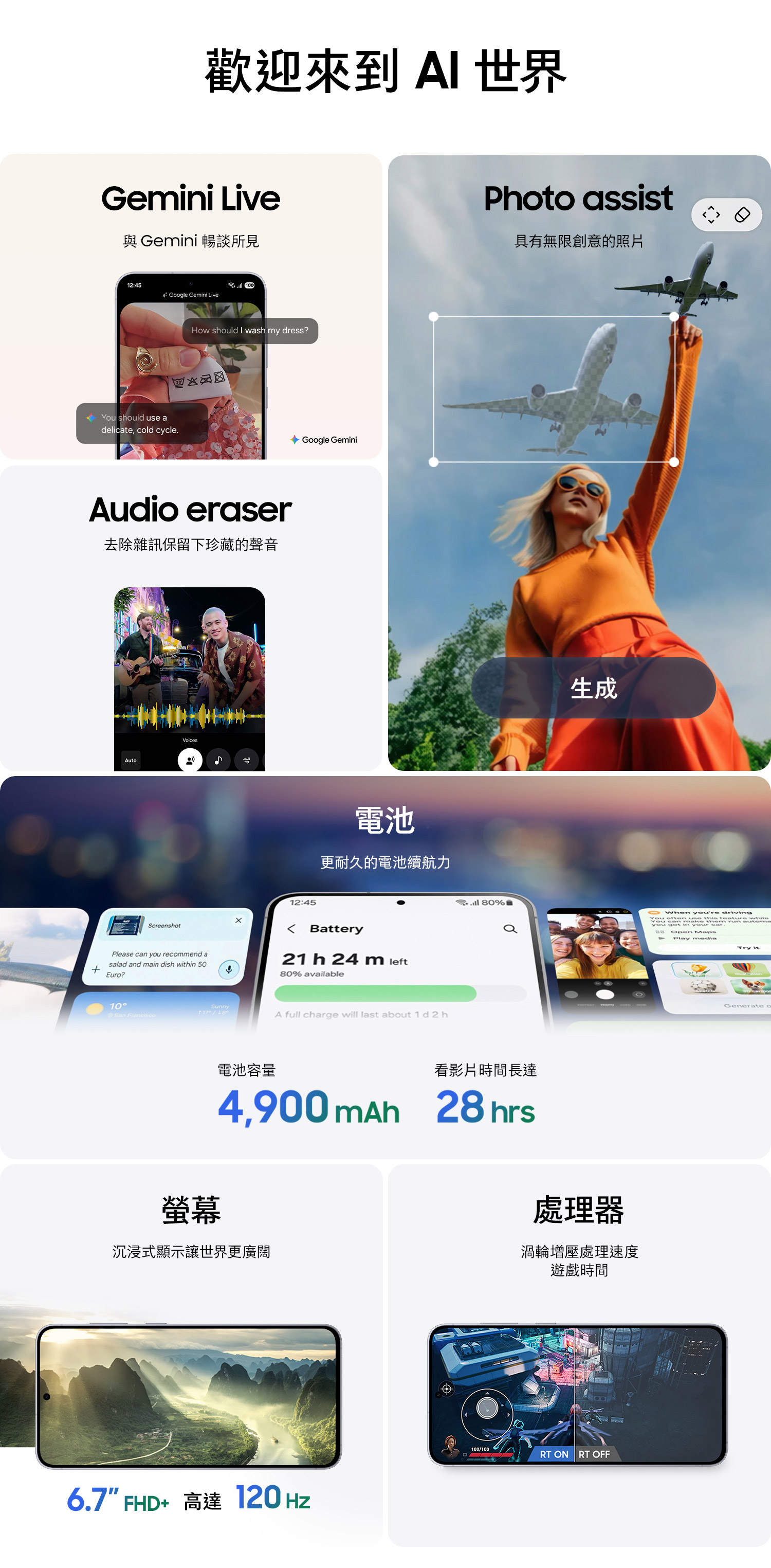 - 限於2026/1/31前在 Galaxy S25 FE (8+256G)手機中開啟 [Gemini] APP並登入 Google 帳號,於視窗顯示[免付費試用 Google AI Pro] 按下 [立即試用],並跟著螢幕指示,即可開始試用6個月Google Pro AI擴充功能與2TB雲端儲存空間。