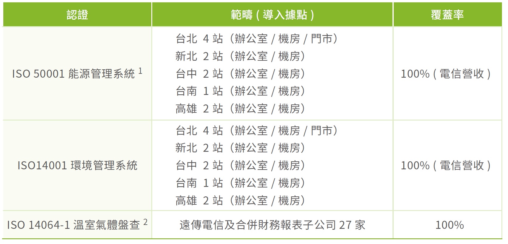 遠傳接軌國際管理標準, 持續導入 ISO 14001 環境管理、ISO 50001 能源管理、 ISO 14064-1 溫室氣體盤查、ISO 46001 水資源效率管理,訂定「遠傳環境暨能源政策」、「溫室氣體管理政策聲明」、「環境暨能源管理辦法」作為遠傳管理各類環境衝擊之指引;並依據「環境暨能源管理辦法」成立「環境暨能源管理組織」,落實本公司環境暨能源、水資源管理系統之有效運作。