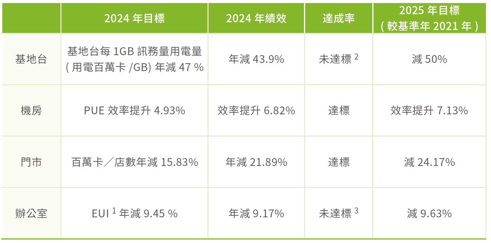 - 註3. 因2023 年12 月亞太合併,亞太全年EUI 較遠傳高1%,合計結算影響整體績效,後續將加強用電管制與節能計畫推動
