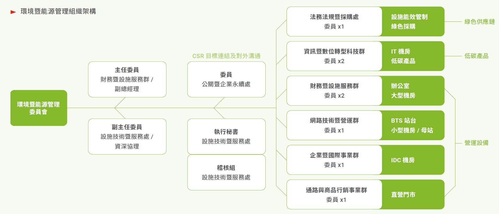 為確保環境政策的有效推動,遠傳建立清晰的問責機制與授權制度。環境暨能源管理組織為執行主體,成員涵蓋各部門主管與專業人員,負責統籌政策的規劃、落實與成效評估,並定期召開會議進行檢討與調整。各部門則依據職責分工負責其所屬單位的環境績效,並需定期向委員會彙報進度,形成由上而下與部門橫向協作的管理架構。此外,遠傳鼓勵員工主動參與並提供建議,結合持續追蹤與內部培訓機制,強化政策的執行力與回饋修正能力。