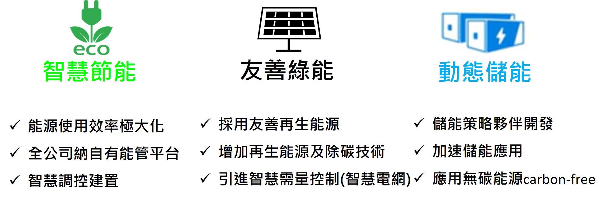 遠傳中長期減碳策略以節能優先、加速綠能、儲能跟進為三大核心,並配合政府能源轉型與電業改革政策,結合遠傳核心能力,考慮節能技術、儲能、智慧電網與電表及系統整合,發展商機。