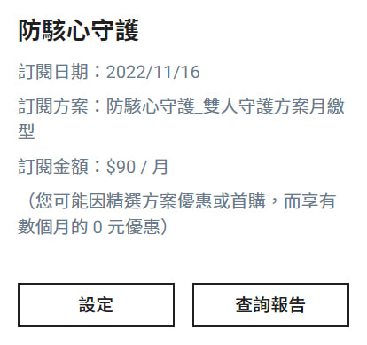 - 首購享 3 個月免月租優惠,限第一次申辦防駭心守護之用戶享有,若之前已申辦過則不再適用,申辦後就會開始扣款。首購 3 個月免月租優惠期滿後,將每月自動扣取費用,若要取消服務,在線上、客服、門市均可取消。費用採每月先收制,會每月自動續扣,用戶可隨時取消服務,取消後仍可使用至該月週期結束。
